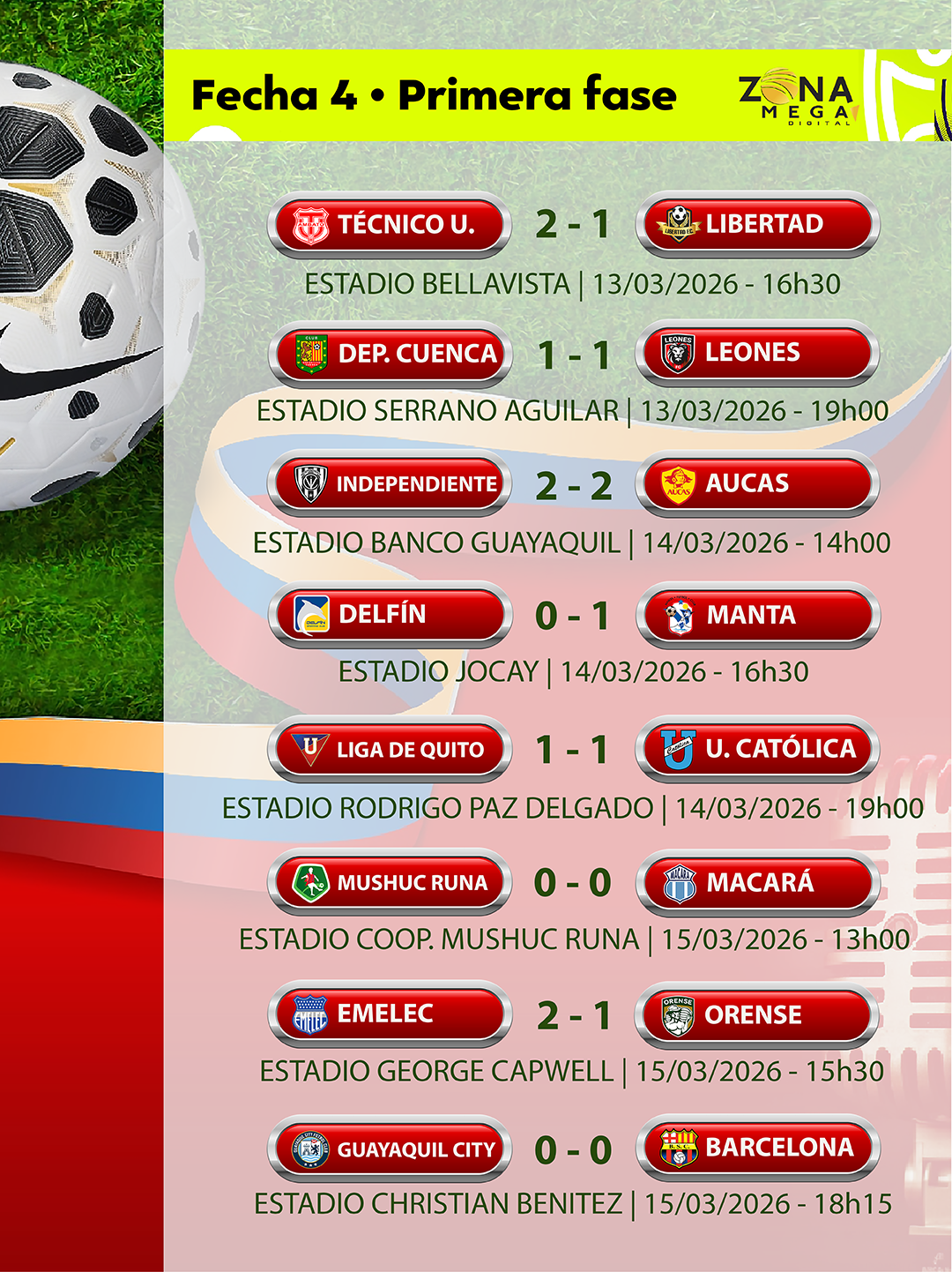 En el Estadio Christian Benítez Betancourt de la ciudad de Guayaquil por la Fecha # 4 de la Fase Inicial de la Liga Pro Ecuabet 2026 Barcelona empató 0 por 0 en calidad de visitante con el cuadro del Guayaquil City. |