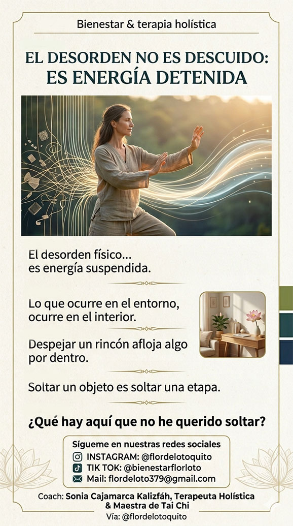 Desde una perspectiva holística, el ser humano no se divide en partes: lo que ocurre en el entorno ocurre también en el cuerpo y en las emociones. Un espacio cargado de objetos acumulados, de cosas "pendientes", de cosas que "ya voy a resolver", vibra con esa misma postergación. Vivir rodeada de ese ambiente es como practicar Tai Chi con los hombros encogidos: el movimiento existe, pero está frenado desde adentro.
